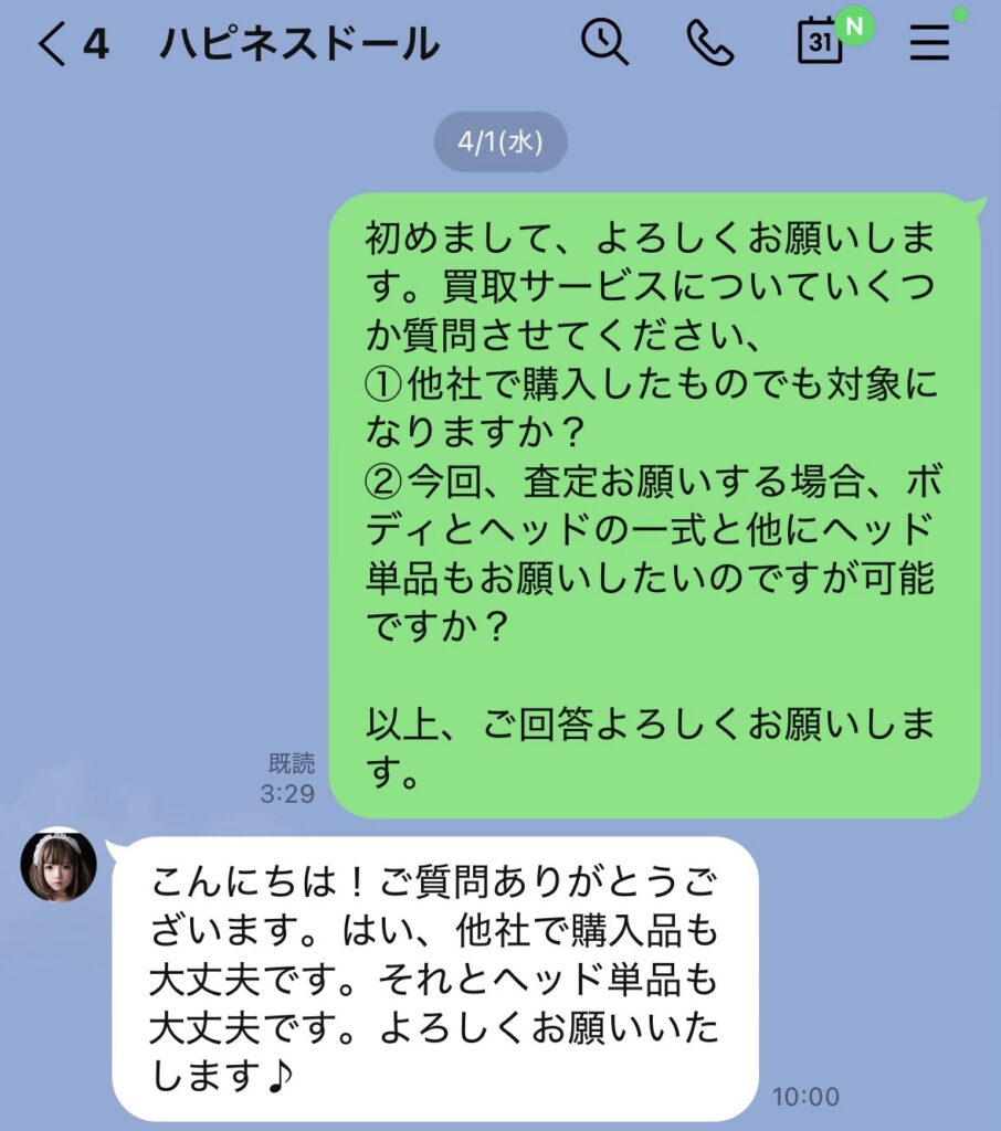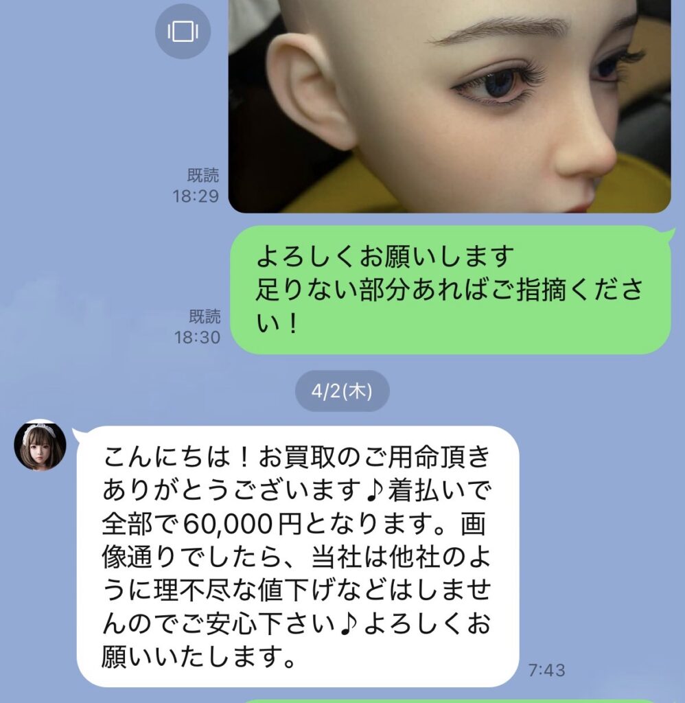 だが今回のハピネスドールの買い取りはねず太郎さんみたいに顔出しで何年も動画を出している人が告知するのだしハピネスドールさんも知名度もありドールレンタル事業もやっている店なのでノウハウもあるだろう、だから信頼度は高いなと思って試しにLINEで問い合わせしてみる。
