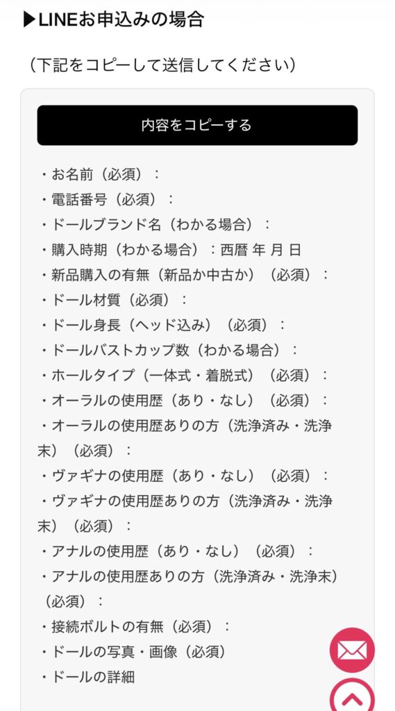 ↑ハピネスドールさんのページから買取の案内ページを見ていくとLINEの場合申込の場合の入力フォームがあるのでコレをコピーしてLINE文章で入力